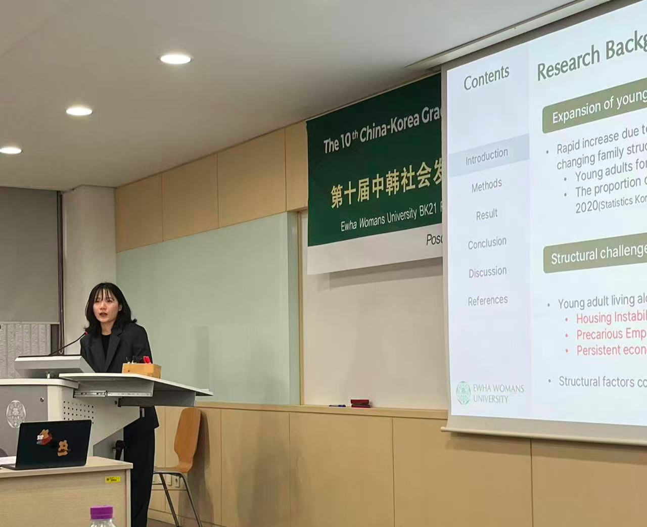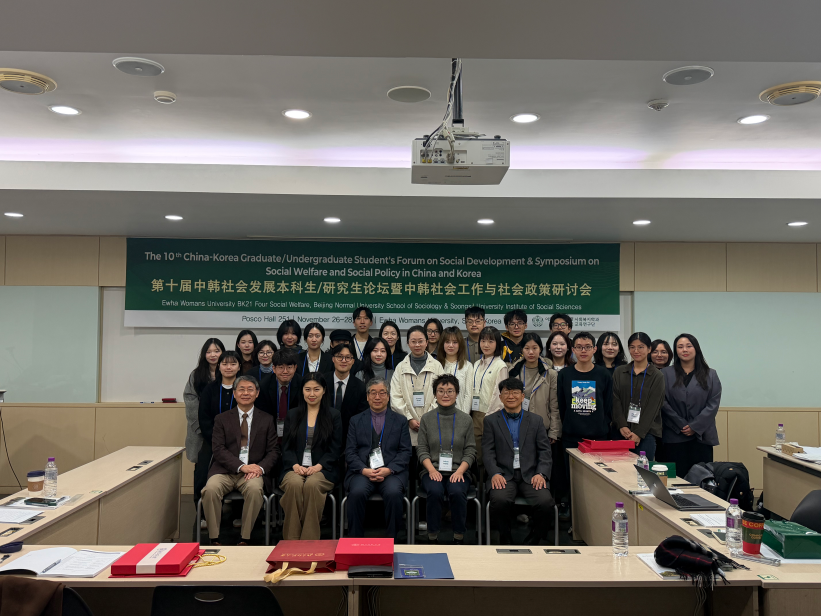 2025年11月27日,第十届中韩社会发展本科生/研究生论坛暨中韩社会工作与社会政策研讨会在韩国梨花女子大学顺利举行,我院付媛媛副教授、杨力超副教授与博士研究生滕嘉暄、张世甲,硕士研究生梁文绮,本科生邓子阳、但姝瑶、马澜月、徐新然、陈晗、陈嘉烨、杨梓灏参加了此次会议。