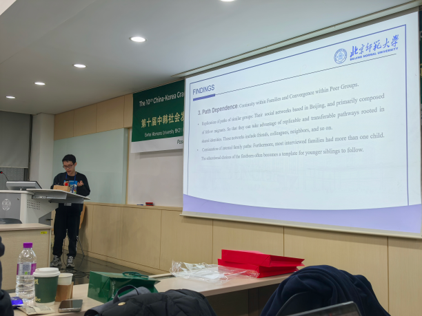 上午第二场研讨围绕“儿童青少年发展”展开,议题包括:北京流动儿童的教育选择、移民青少年的亲子关系与文化适应、澳门中学生志愿活动与自我实现、数据解读子女性别对父母幸福感差异子女性别结构对父母主观幸福感的影响等。在随后的讨论环节中,各位教授不仅肯定了同学们的问题意识与研究热情,也从中韩社会结构与文化差异的视角进行了深入点评,引导大家从比较视野进一步思考与拓展研究方向。