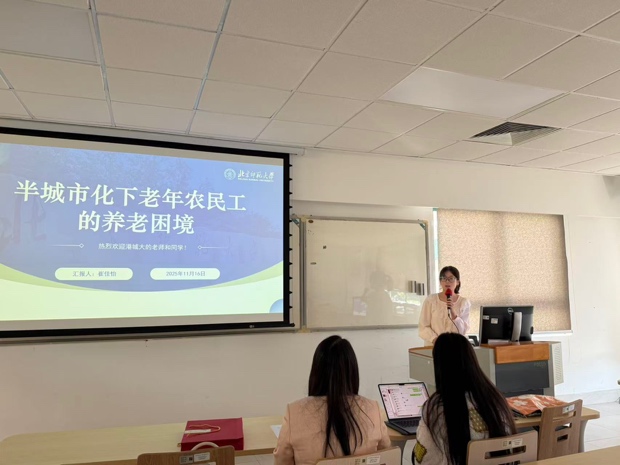在“半城市化下老年农民工的养老困境”主题分享中,崔佳怡同学基于质性研究,指出老年农民工在经济供养不足、照料需求隐蔽与情感慰藉匮乏等方面面临三重困境,且进城务工所带来的“半城市化”状态在一定程度上加剧了其养老困境,呼吁社会政策与服务体系进一步回应这一特殊群体的实际需求。