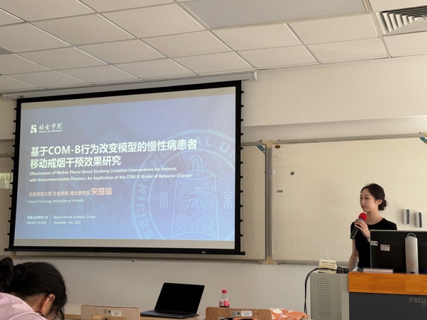 宋楚瑜同学以“基于COM-B行为改变模型的慢性病患者移动戒烟干预效果研究”为题,介绍了基于动态、调整性干预模式,探索为慢性病患者提供个体化戒烟服务的实践路径,并就香港城市大学贾子元同学提出的有关戒烟服务需求的问题进行了回应与交流。