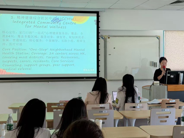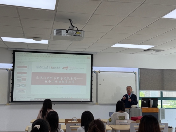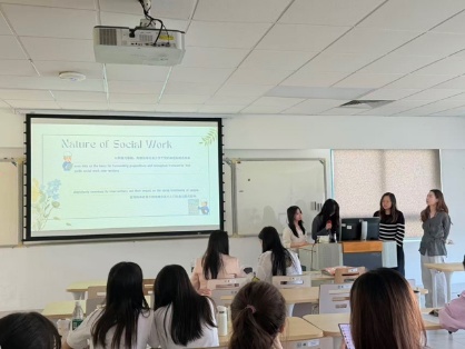 第二组由Chang Sum Kiu Jessica、Leung Tsz Ching等四名同学介绍了“香港社会工作理论与实务”,从社会工作价值观、专业原则与实务技巧出发,阐释社会工作在不同服务领域中的具体运用,并结合案例说明社会工作如何在个体、小组与社区层面发挥专业功能。分享结束后,沈希恩助理教授还就香港与内地在社会工作术语上的差异进行了详细解释,帮助在场同学加深对两地社会工作语境与制度背景的理解。