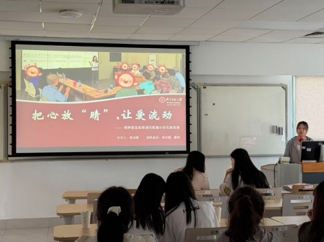 黄诗燕、潘雨同学以“把心放‘晴’,让爱流动——精神康复家庭减压赋能小组的实践探索”为主题,围绕精神康复家庭的实际需求,介绍了“把心放晴”小组六节活动的设计与实施,强调家庭在精神障碍患者康复过程中的关键作用,并基于小组成效进行了反思与展望。在提问交流环节,张凯怡同学就实习社工与年龄偏大服务对象之间建立专业关系的难点分享了自己的思考,与在场同学共同探讨如何消解代际差距、提升服务效果。