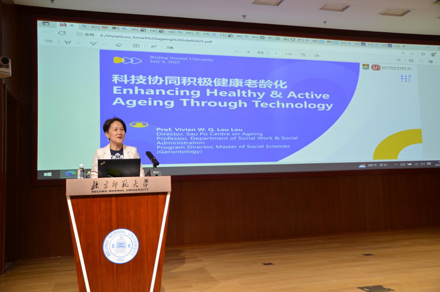 在开营仪式上,香港大学秀圃老年研究中心总监、香港大学社会工作及社会行政学系教授楼玮群为营员们带来了“科技协同积极健康老龄化”主题讲座。楼教授指出,全球可持续发展面临人口结构变化等四大挑战,而人口结构变化为积极健康老龄化提供契机,科技发展亦带来新可能,分析了老年人接受科技的影响因素、技术采纳的挑战及成功实施的条件,呼吁通过以用户为本的设计和共建支持环境推动积极健康老龄化。讲座深入探讨了科技与人口结构变化的关联,为应对老龄化问题提供了兼具理论与实践价值的思路。讲座后,同学们积极思考、踊跃交流,在“科技助老”、农村地区数字鸿沟等方面探讨了有意义的问题,获得了宝贵的指导和启发。社会学院付媛媛副教授出席了本场讲座。
